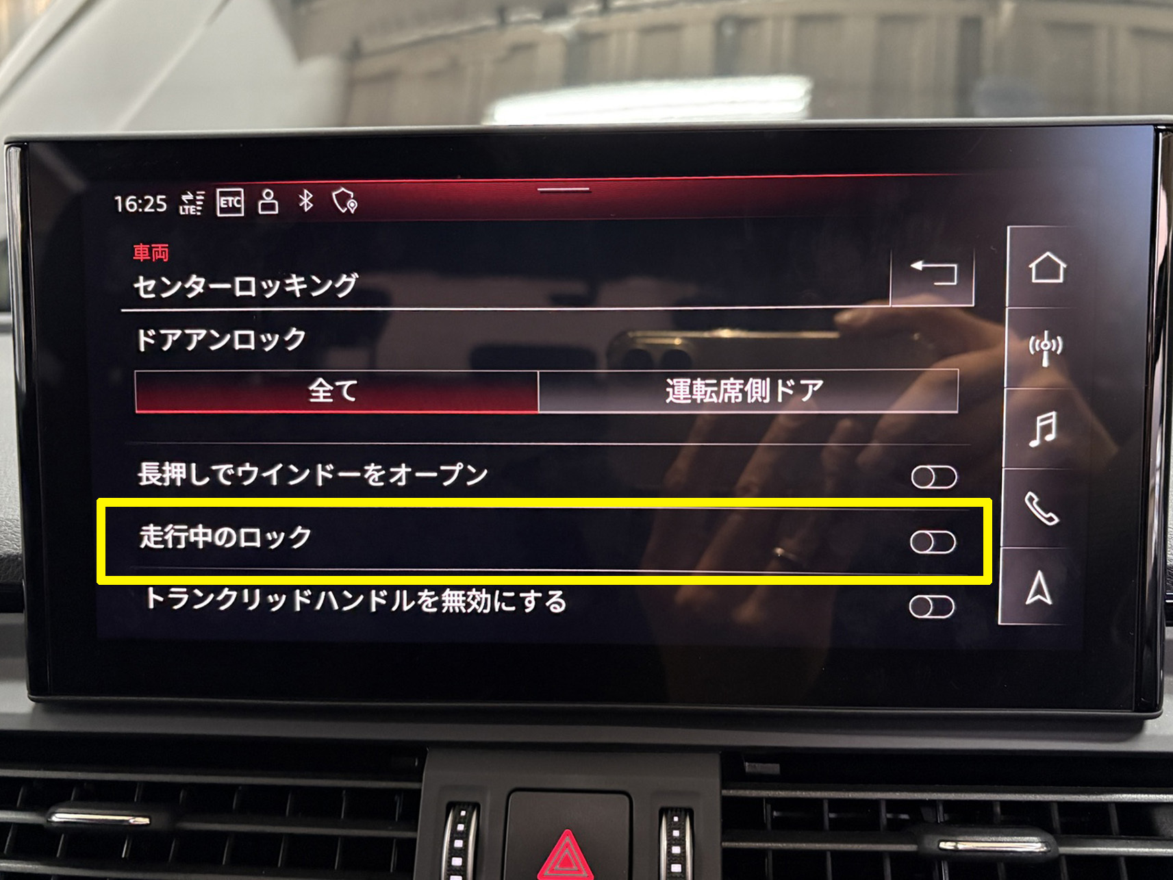 車速ドアロックは、MMIにメニューを表示させて項目をオフにすることで解除できます。