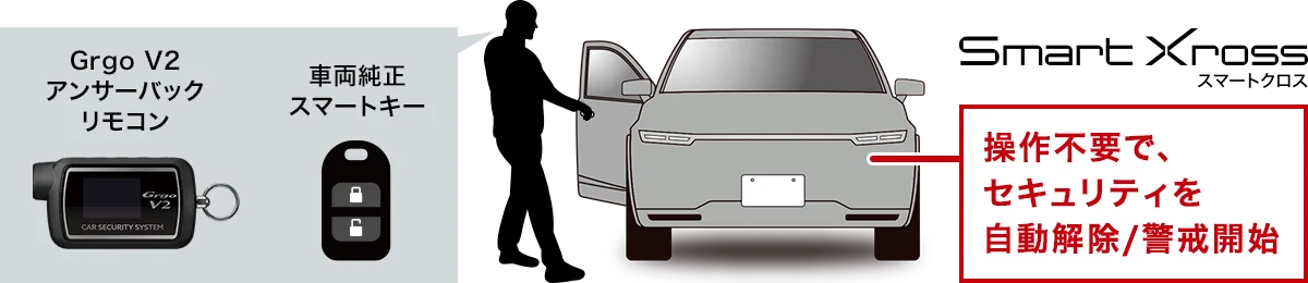 車両純正スマートキーとGrgoV2リモコンを一緒にお持ちいただければ、操作を行うことなく自動でセキュリティ解除/警戒開始します。